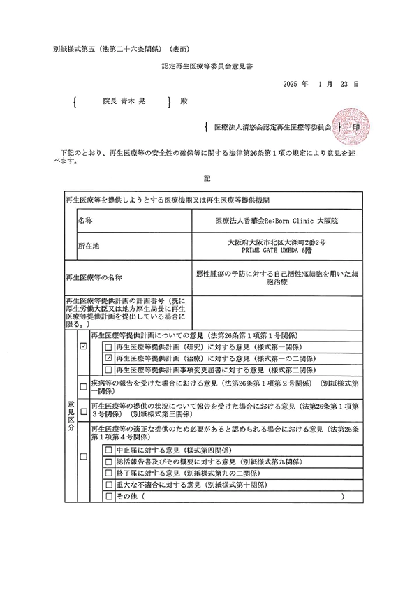 最先端医療である再生医療を正しく、安全に行うために、特定認定再生医療等委員会において治療の妥当性・安全性・医師体制・細胞加工管理体制に対し、厳しい審査が行われます。 その審査の基準を満たし、適切な治療計画を提出することで、厚生労働省から治療に対する認可番号が付与されます。